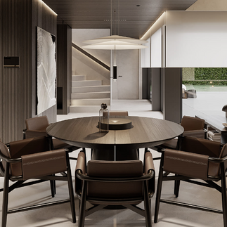 Clássico e sofisticado, elegante e moderno, atencioso e não convencional - é assim que se pode descrever este interior. Foque a atenção nos móveis - a área de jantar para ser mais preciso. Basta olhar para esta elegante mesa, poltronas e a luminária em cima delas - as proporções, cores e materiais perfeitamente escolhidos criam não apenas uma imagem visualmente perfeita, mas também um espaço confortável, conveniente e aconchegante para passar o tempo.